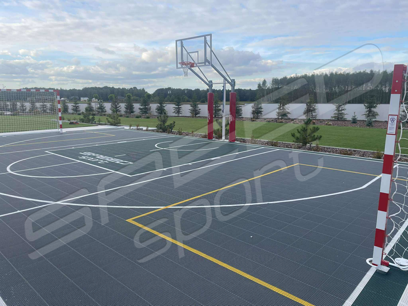 Boisko wykonane z nawierzchni polipropylenowej, bezpieczne i łatwe w montażu.